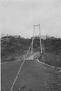 左の写真をみると中学一年生の通学の風景がまざまざと浮かんできます。飲み屋さんのいっぱい入ったサトミ会館の横をまっすぐ行くと,急ながけに出ます。そこから暁橋に降りていく急ながけ。暁橋の下をみると,板の節目や隙間からは泥色をしたシューパロ川の流れが見えます。そこをわたりきると常磐町でした。中学一年の登校途中,やんちゃな上級生がこの橋をよく揺らしました。吊り橋でしたからよく揺れます。私はこの橋の手すりにつかまって青い顔をして,ようやく渡り終えた苦い思い出が真っ先に浮かんできます。本当に橋が落ちるのではという気がして,私はこの橋はあまり好きではありませんでした。やはり危険な橋だったのか,そのうち通学路としては通行禁止になったように思います。しかし,鹿島東小の前を通り,常盤橋を通るよりもかなり近くなるので,その後も時々使っていたものです。
